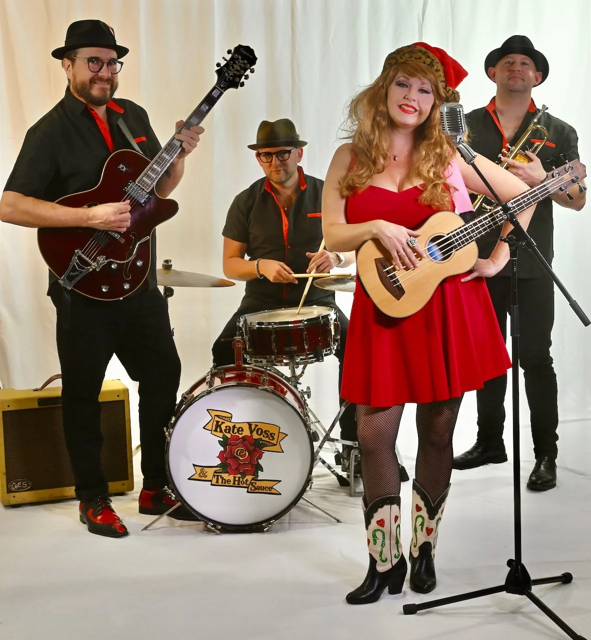 The “Hot Sauce Holiday” show has the perfect blend of rockin’ holiday tunes like “Jingle Bell Rock” mixed with some classics that everyone will want to sing along to like “Blue Christmas”. This band will steal your heart with songs like “Mister Santa” and get the party started with Brenda’s Lee’s “Rockin’ Around The Christmas Tree” while keeping kids from 1 to 92 laughing with G rated jokes about Rudolph’s report card (spoiler alert, he went down in History…). Kate Voss & The Hot Sauce make the most wonderful time of the year even more special with their lighthearted approach to the holiday spirit and their exciting showmanship featuring award-winning musicians Mike Underwood on drums/percussion, Jason Goessl on guitar and Kate Voss on vocals, ukulele bass and melodica.